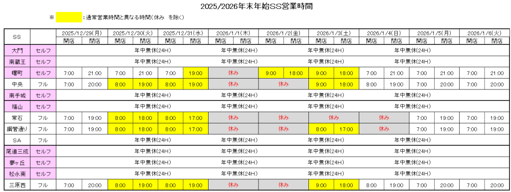 大門SS、南蔵王SS、南手城SS、福山SS、福山SASS、尾道三成SS、夢ヶ丘SS、松永南SSは年中無休(24H)で休業はございません。